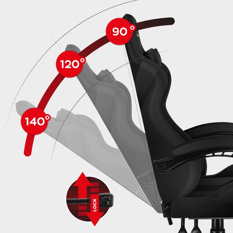 Uma cadeira de jogos moderna que combina ergonomia com um acabamento elegante em carbono. Concebida para sessões prolongadas, oferece um encosto ajustável, um apoio para os pés rebatível e um conjunto de apoios para o pescoço e a região lombar, apresentando simultaneamente um visual elegante e subtilmente arrojado.