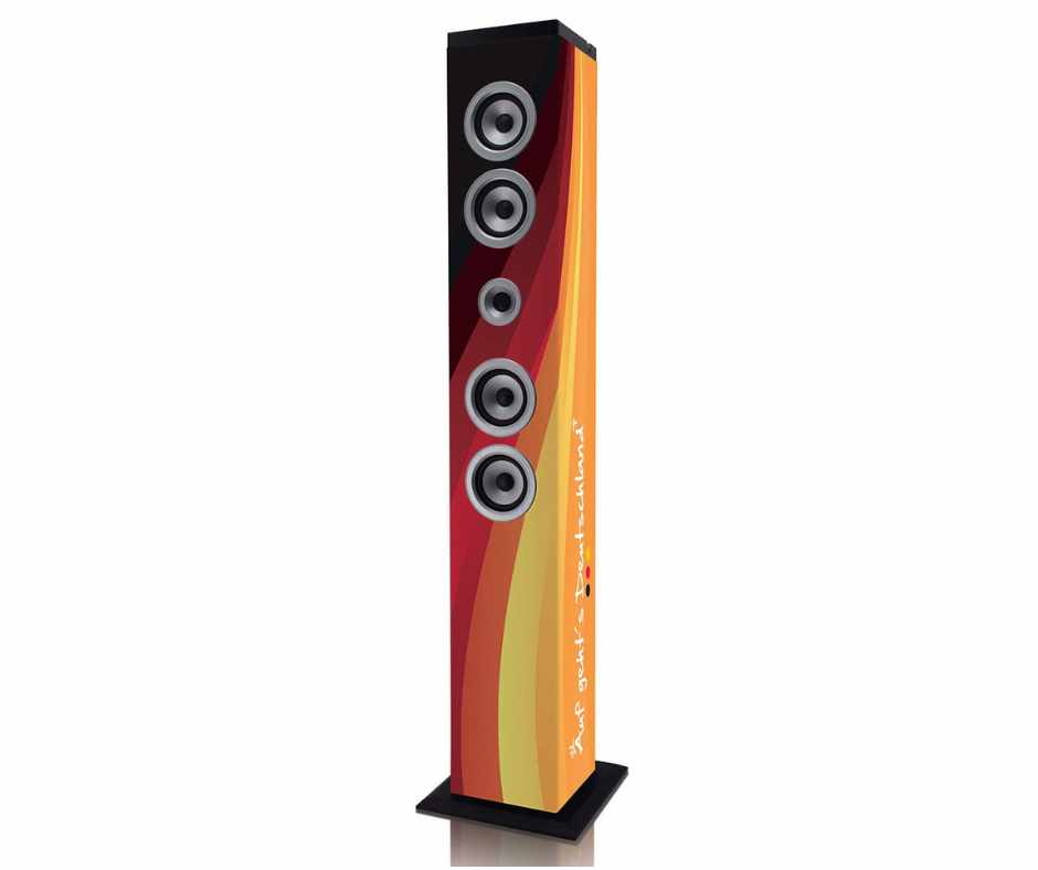 Além de uma entrada USB e SD, há também uma entrada AUX. Este altifalante IBT-6 da Ices ostenta a bandeira alemã. Para os entusiastas, este altifalante é indispensável. Este altifalante está disponível com seis estampados diferentes: Deutschland, Zebra, Sea, New York Liberty, Roma e Tags.