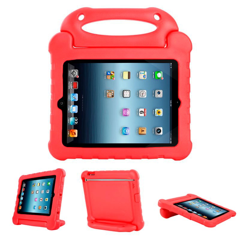 Material resistente a choques, com suporte dobrável que serve de alça para transportar com mais conforto e também serve para manter o tablet na horizontal e poder assistir a vídeos com mais conforto.