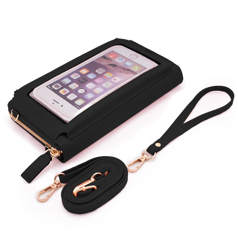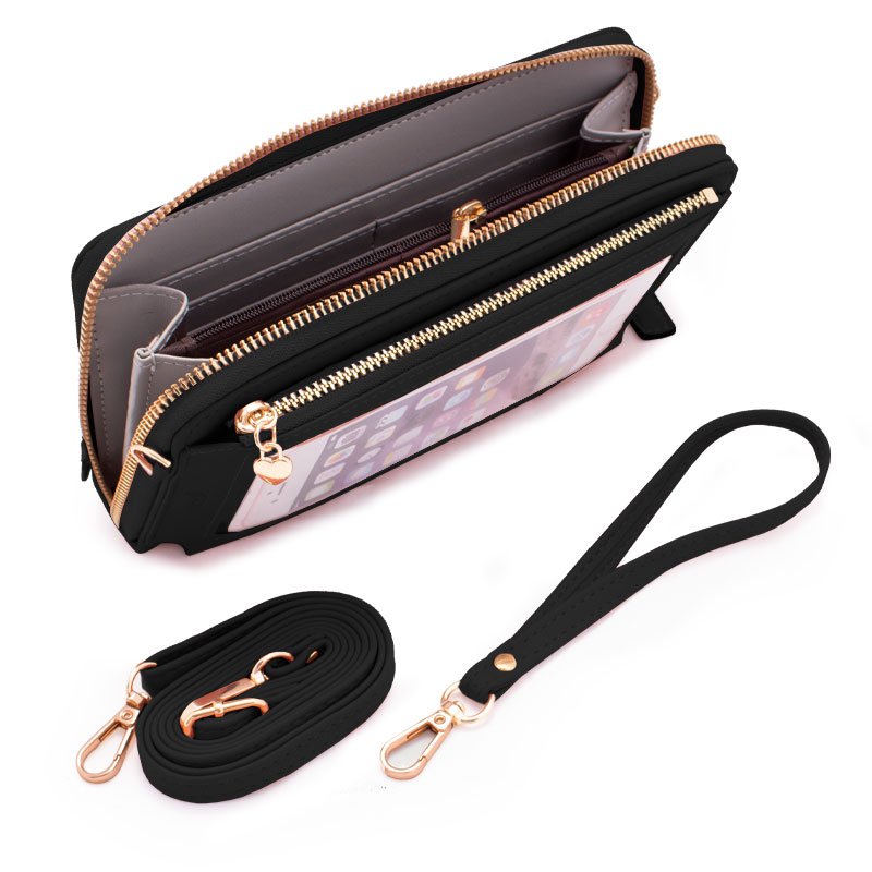 No interior possui divisórias, porta-cartões, um bolso com zíper para guardar moedas ou pequenos objetos, e na parte frontal possui uma divisória transparente para visualizar a tela do seu smartphone ou colocar fotos ou sua carteira de identidade.