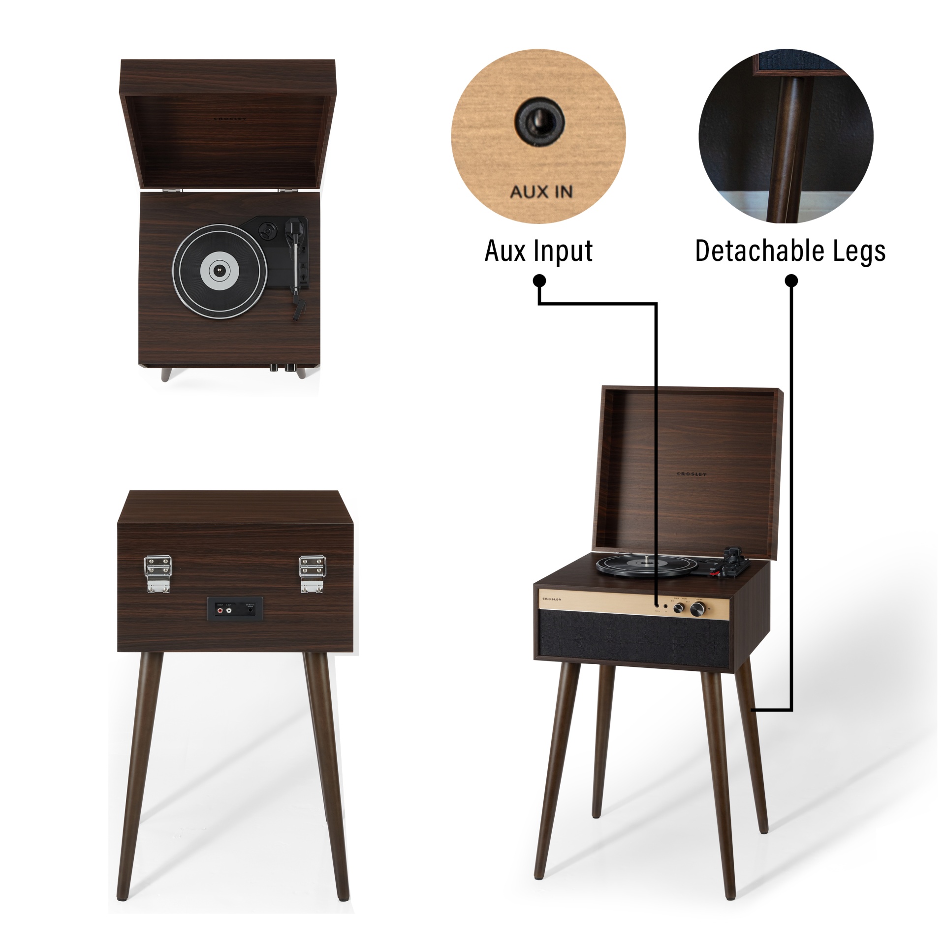 O Crosley Jasper Walnut oferece exatamente isso. Com 3 velocidades (33 1/3, 45, 78 RPM), pernas destacáveis, altifalantes integrados e conectividade Bluetooth (entrada e saída), ele adapta-se a qualquer espaço e momento. Reproduza vinis de 7”, 10” ou 12” com rotação suave e som cristalino.