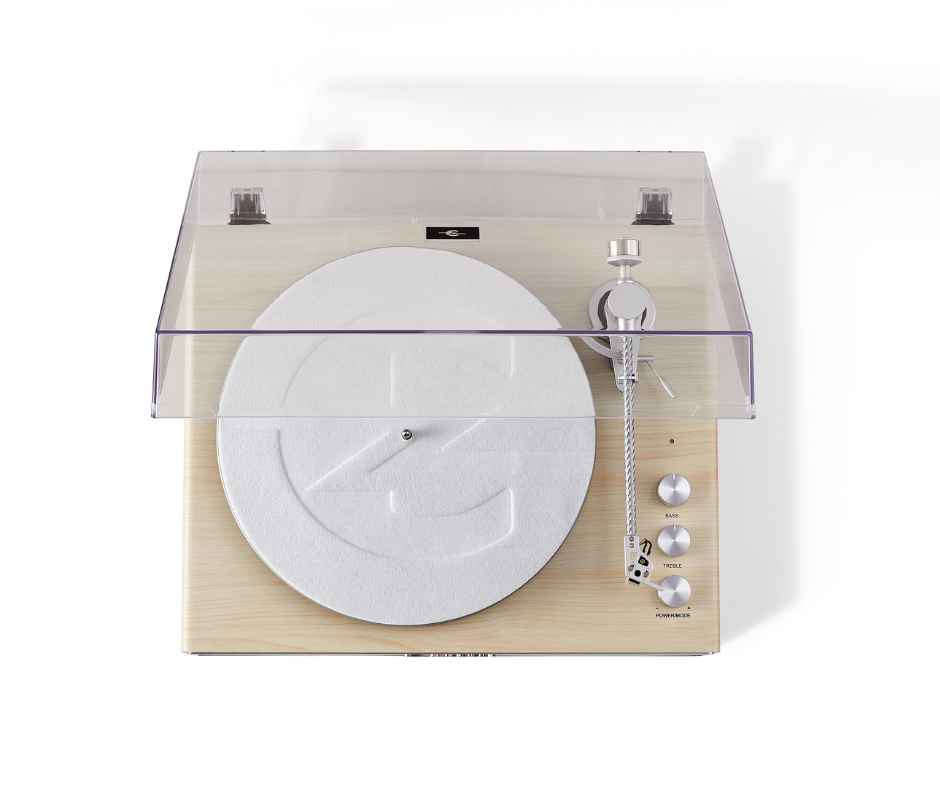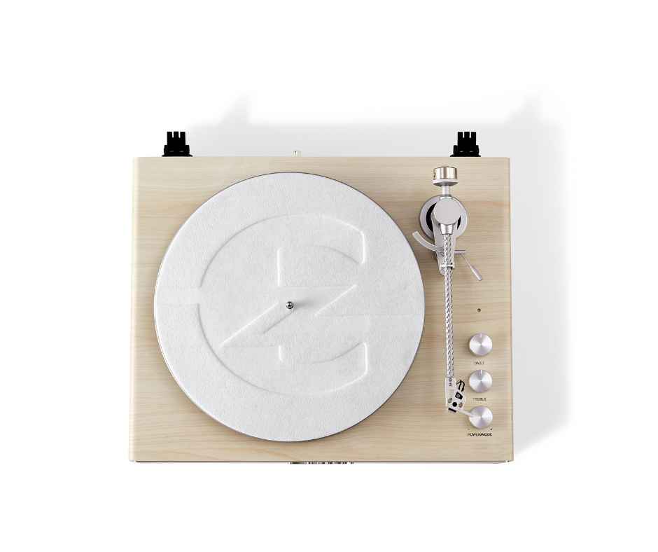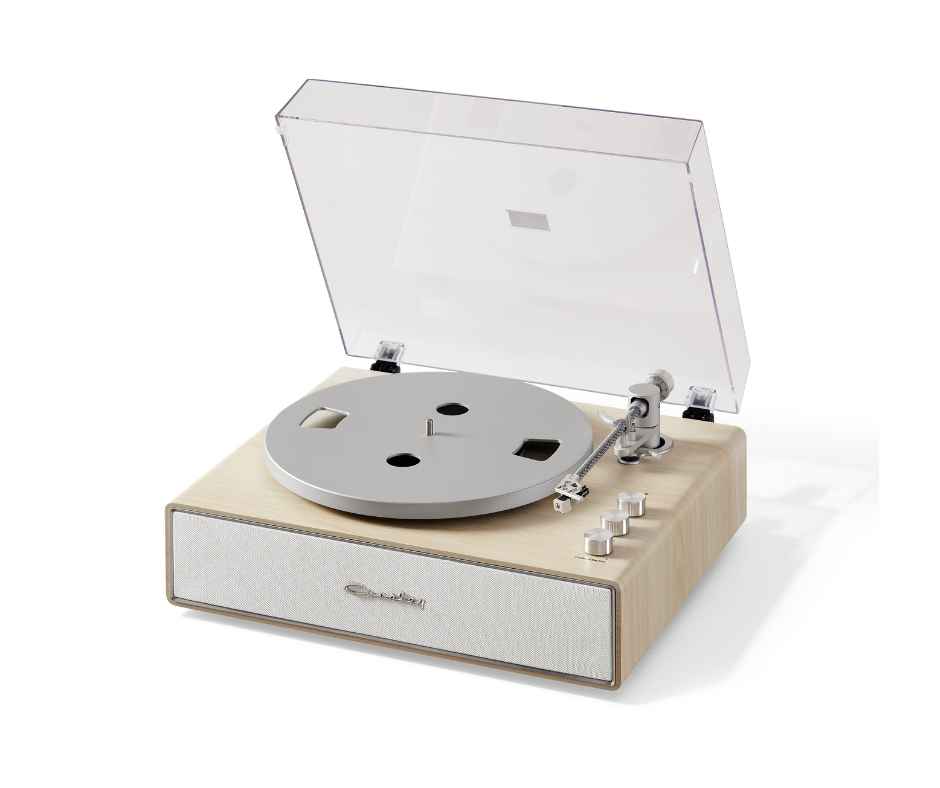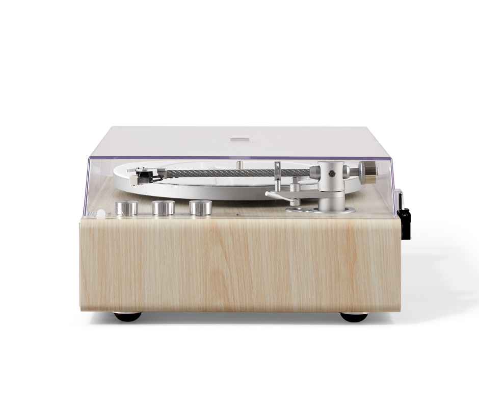O adaptador de alimentação AC permite uma operação estável, enquanto o braço em fibra de carbono com contrapeso ajustável assegura rastreamento preciso dos sulcos dos discos.