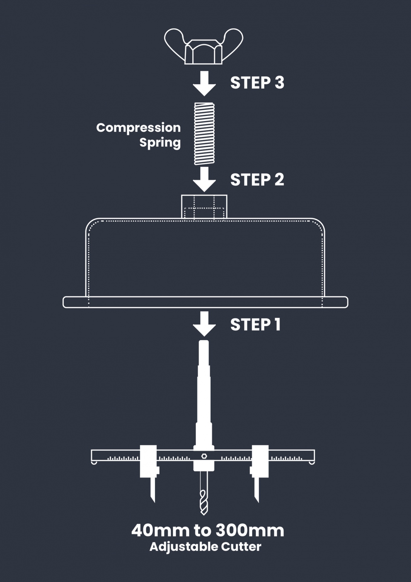 Esta ferramenta é capaz de cortar furos redondos de 40 mm - 300 mm de diâmetro com um máx. profundidade de corte de corte - 30mm (máx. 1mm em metal).