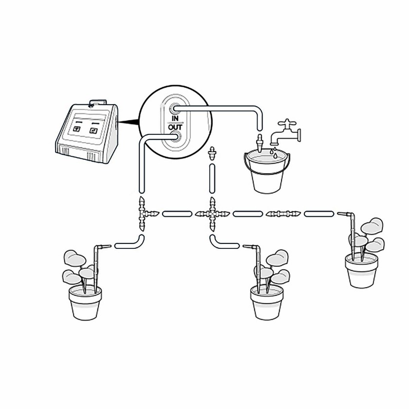 Corte os tubos de 10 metros incluídos com todos os seus acessórios e use-os para alcançar as plantas necessárias. ou o recipiente de água de sua escolha: balde, garrafa ou regador.