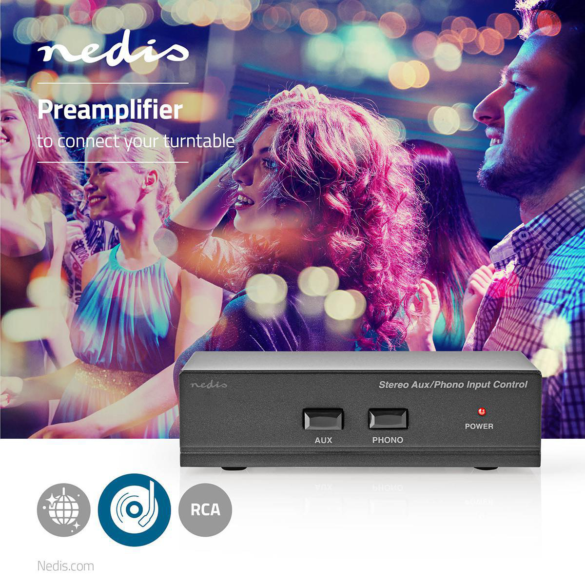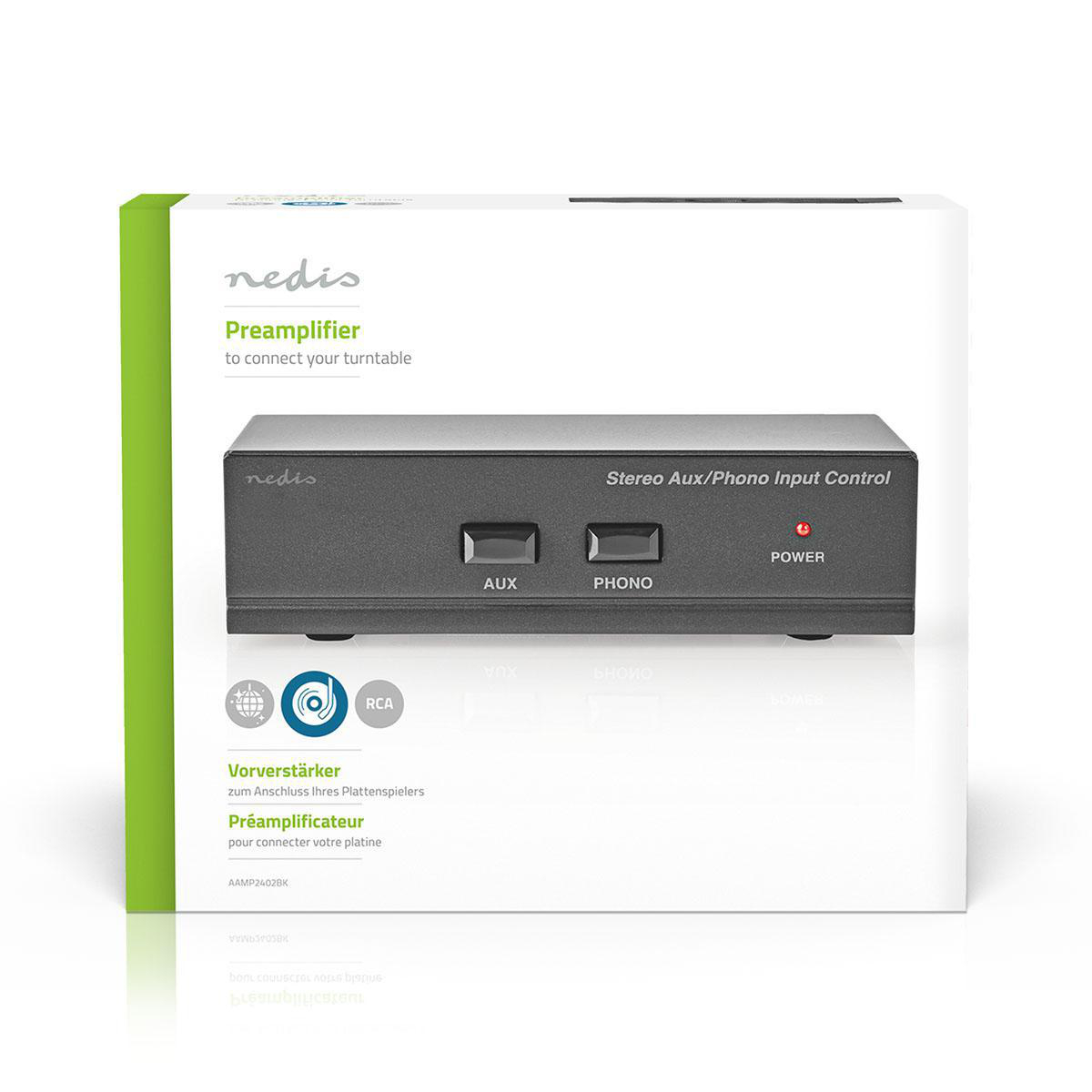 Pré-amplificador estéreo adequado para inserção entre o gira-discos e outras fontes de baixo nível e entradas AUX / linha em mixers, amplificadores, sistemas stack, etc. Com entradas phono e entrada AUX adicional.