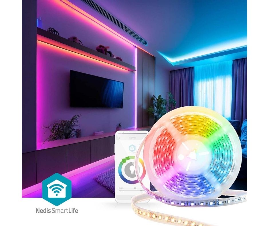 A instalação é muito simples graças ao adesivo 3M de dupla face pré-aplicado, que permite fixar a faixa com segurança em qualquer superfície. Configurar a faixa LED e conectá-la ao seu Wi-Fi através da aplicação Nedis SmartLife é feito em questão de minutos. Descarregue a aplicação, ligue a fita de luzes e siga as instruções da aplicação. A aplicação SmartLife suporta vários utilizadores, pelo que várias pessoas podem aceder à fita LED ao mesmo tempo.